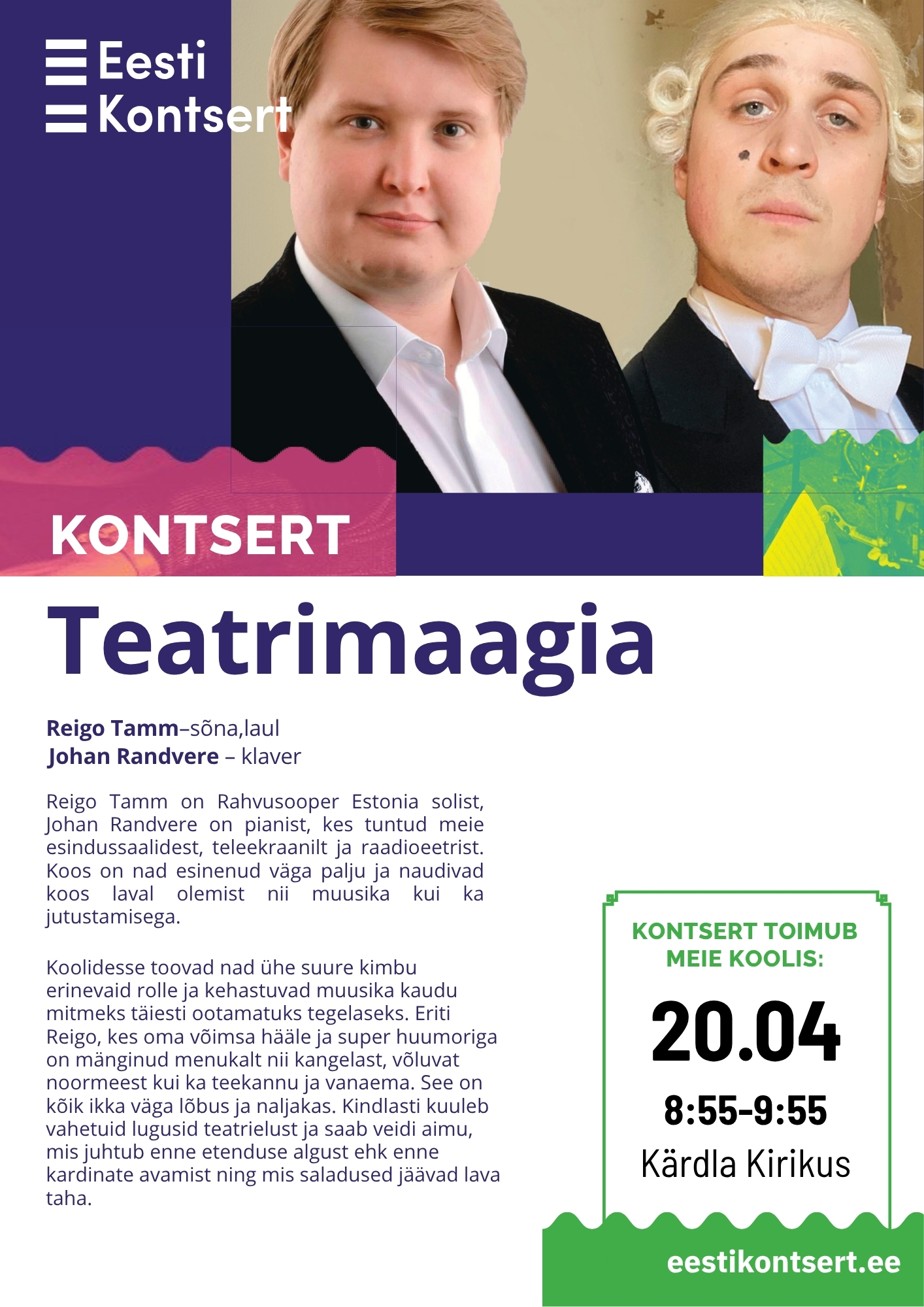 Kärdla Koolis toimub 20. aprillil kontsert-etendus “Teatrimaagia”, kus astuvad üles hinnatud interpreedid Reigo Tamm (sõna ja laul) ning Johan Randvere (klaver).