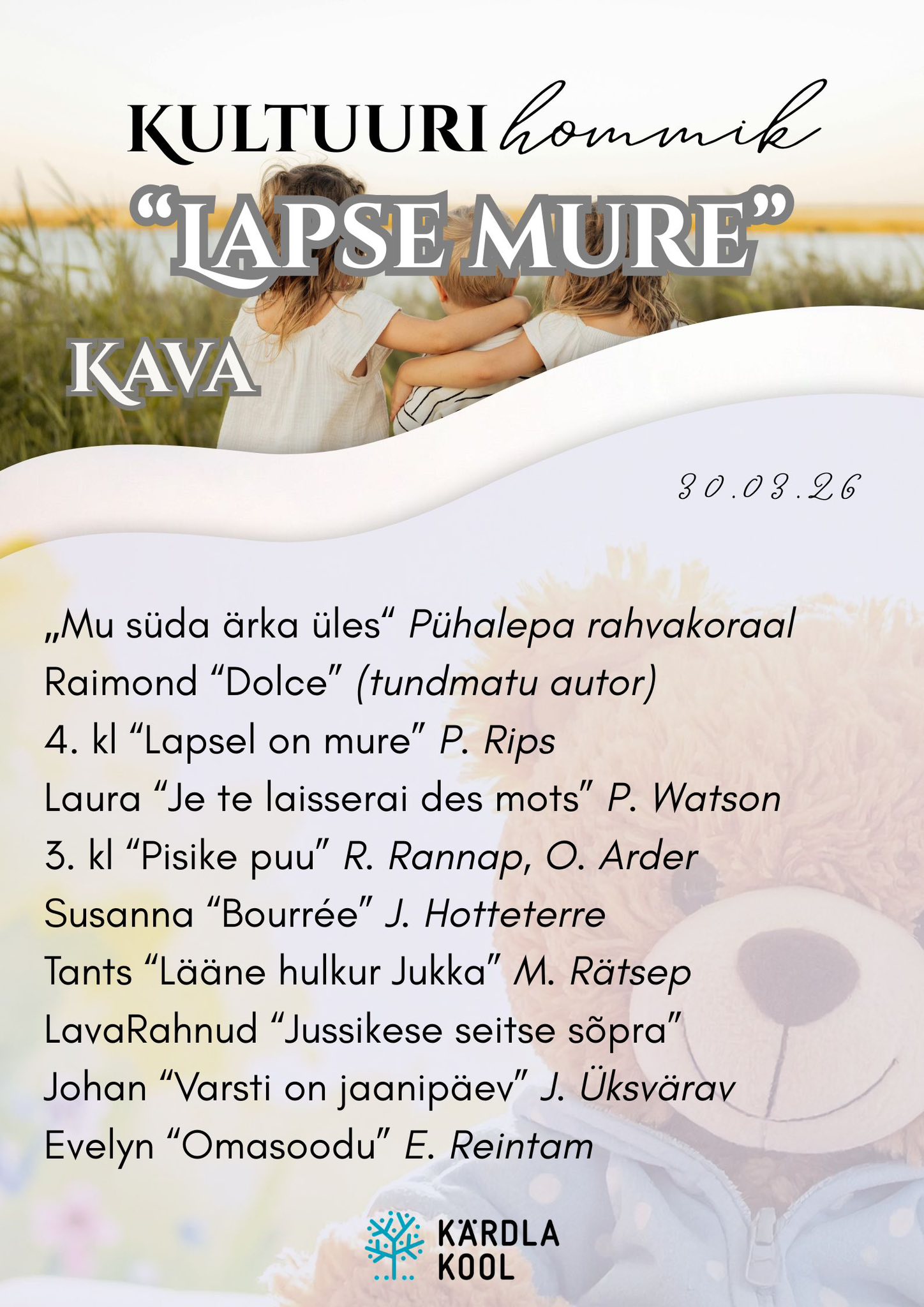 Kell 9.00 ootame 1.–4. klassi õpilasi kultuurihommikule, mille teemaks on „Lapse mure“ – hetk, kus kuulata, mõista ja olla üksteise jaoks olemas.